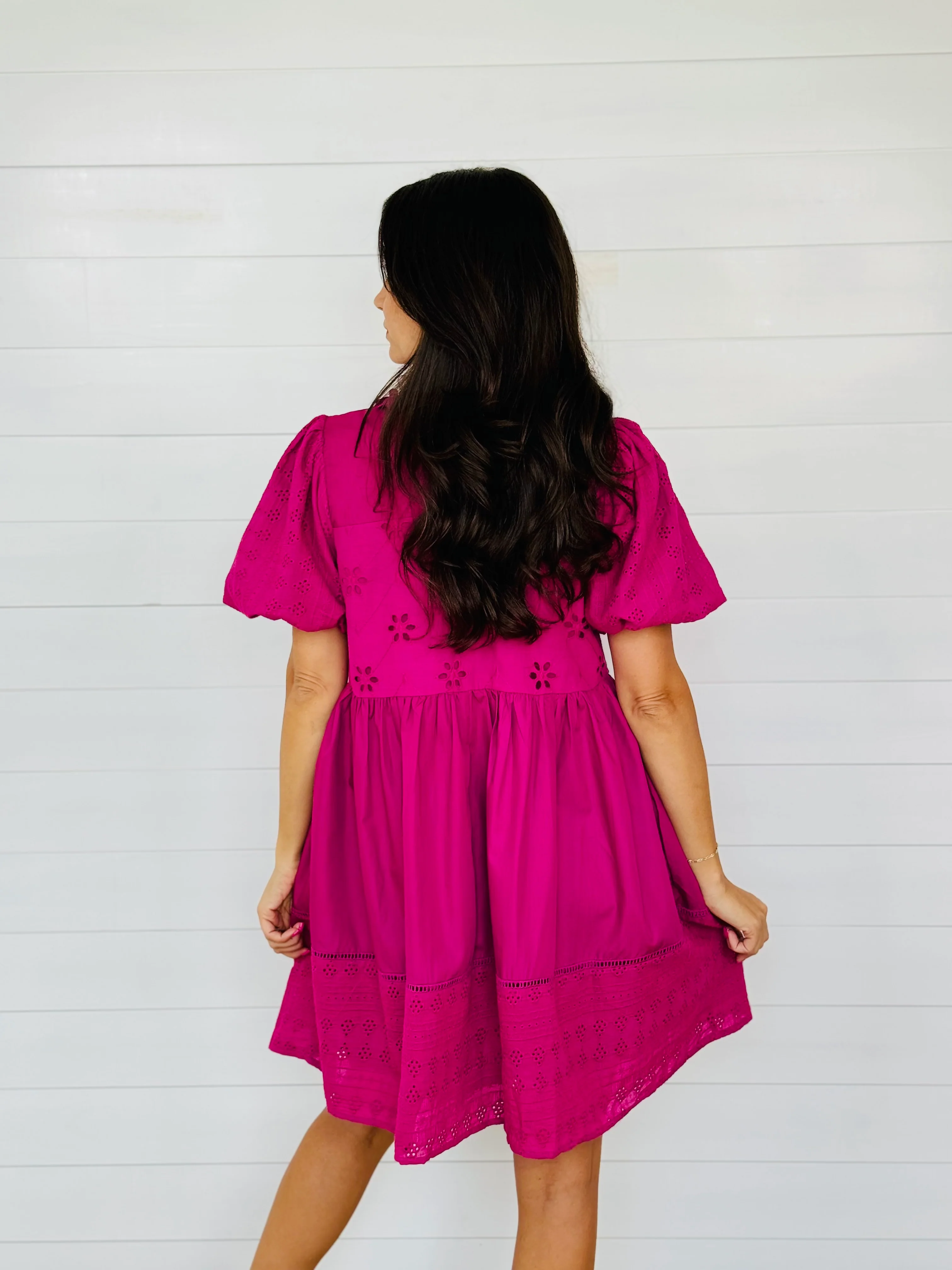 ELISE EYELET DRESS-MAGENTA